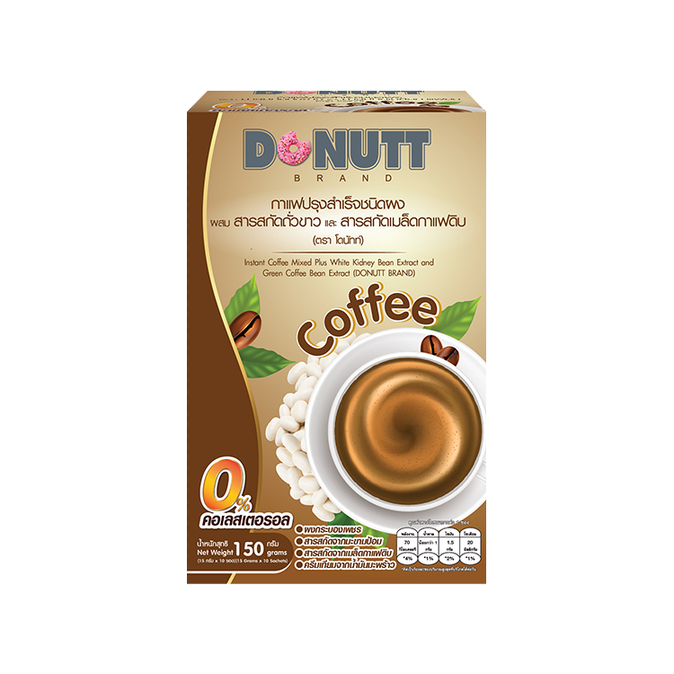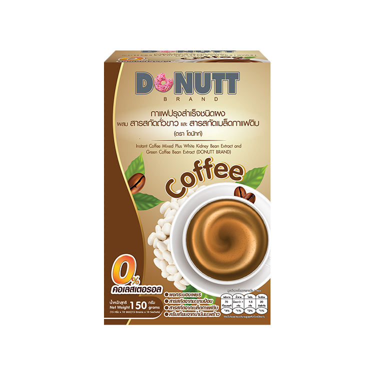 Anyone who likes to drink coffee and has a lifestyle that cares of their body shape will appreciate this coffee, which Donutt Brand recommends. There are main components such as green coffee beans and white kidney beans that helps metabolically-focused, inhibits the process of absorbing sugar, fat and accelerate the process of breaking down fat that accumulates in different parts of the body. Use sucralose as a sweetener instead of sugar and use non-dairy creamer made from coconut oil, which has 0% cholesterol in 1 sachet and provides 70 kilocalories of energy. You can see more nutritional information on the box.